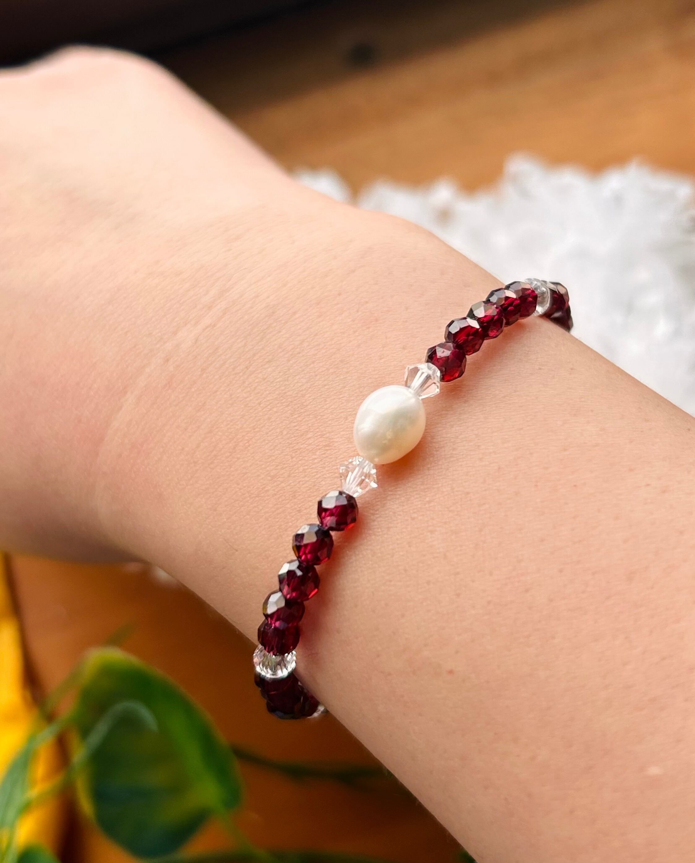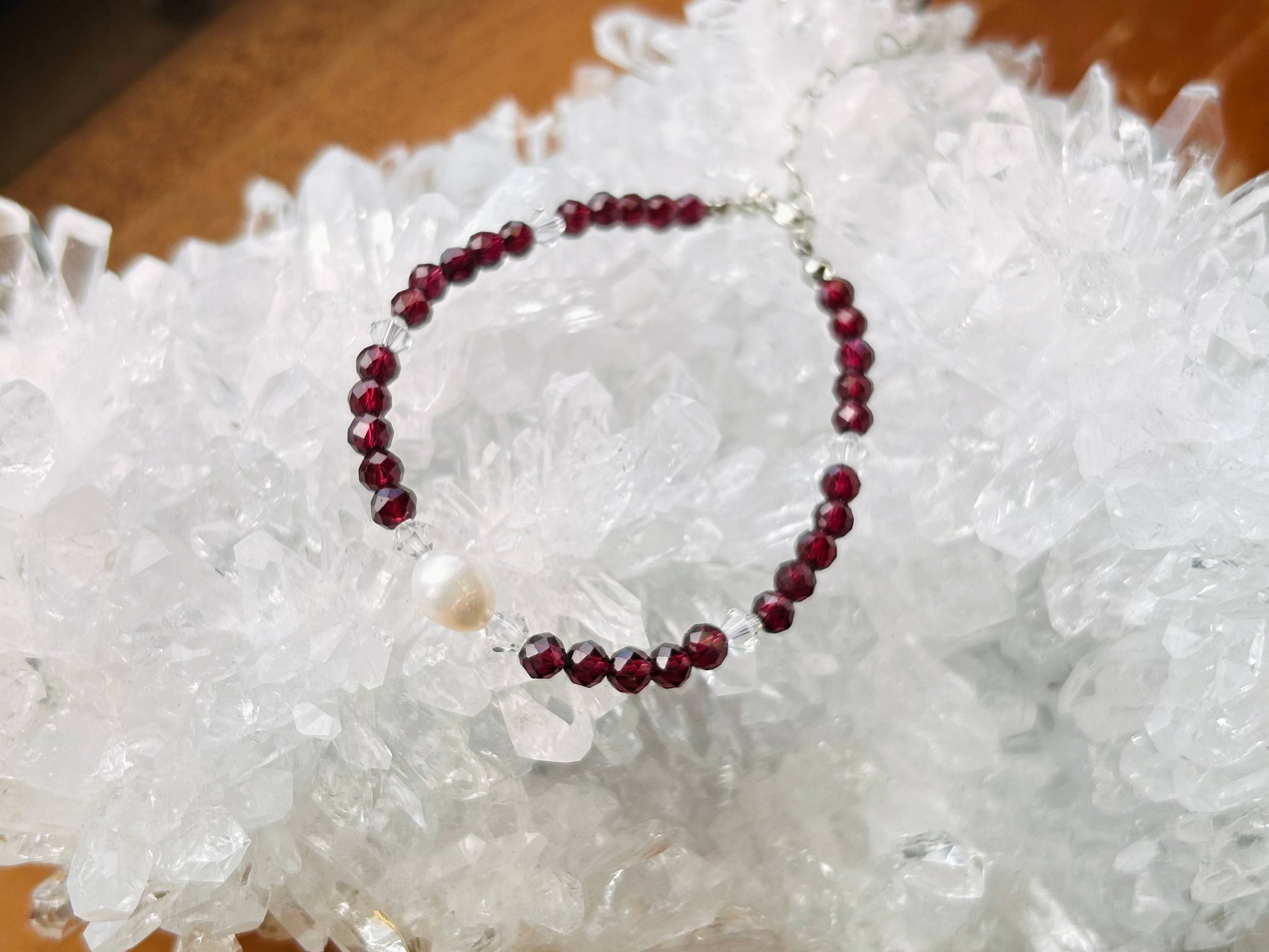 天然石ガーネットと淡水パールのブレスレットです✨ダイヤ型のビーズはスワロフスキーを使用しております。